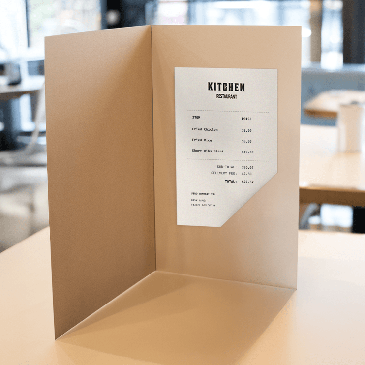 Elegant presenters for checks and receipts. Customizable with logo and design elements. Ideal for restaurants, hotels, and hospitality services.
