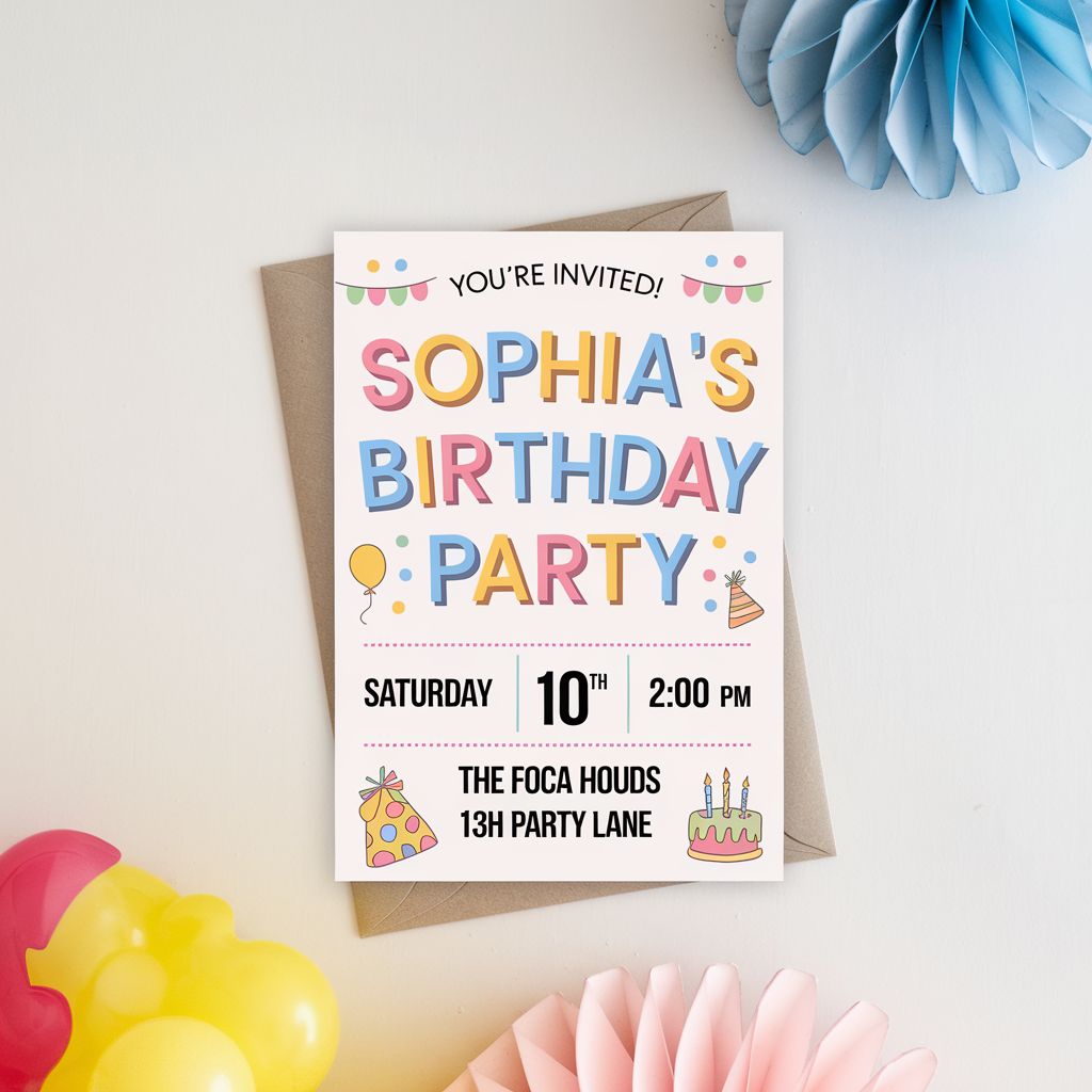 Spaßige Einladungen für Kindergeburtstagsfeiern. Anpassbar mit Themen, Daten und Details. Perfekt zum Teilen mit Freunden und Familie.
